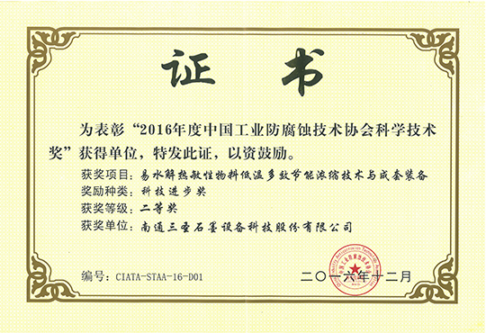 三圣石墨的“易水解熱敏性物料低溫多效節(jié)能濃縮技術(shù)與裝備”獲得中國(guó)工業(yè)防腐蝕技術(shù)協(xié)會(huì)頒發(fā)的科技進(jìn)步二等獎(jiǎng)。此次評(píng)獎(jiǎng)一等獎(jiǎng)空缺,我公司獲得的獎(jiǎng)項(xiàng)為石墨設(shè)備行業(yè)唯一的一個(gè)二等獎(jiǎng)。