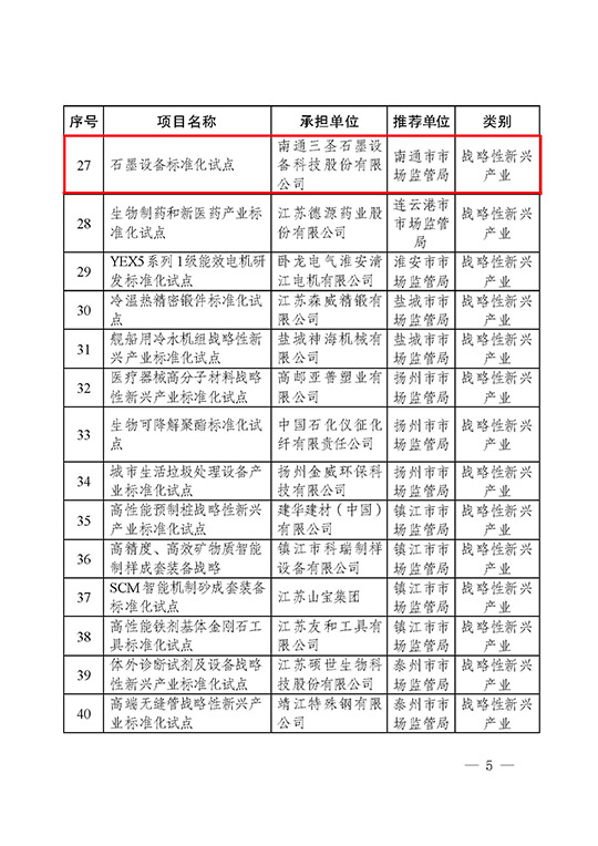 南通三圣標(biāo)準(zhǔn)化工作再傳捷報,公司申報的“石墨設(shè)備標(biāo)準(zhǔn)化試點”項目獲得江蘇省市場監(jiān)督管理局、江蘇省發(fā)展和改革委員會正式立項,成為2022年江蘇省戰(zhàn)略性新興產(chǎn)業(yè)標(biāo)準(zhǔn)化試點41個項目之一,也是南通市獲此立項的兩個項目之一 。