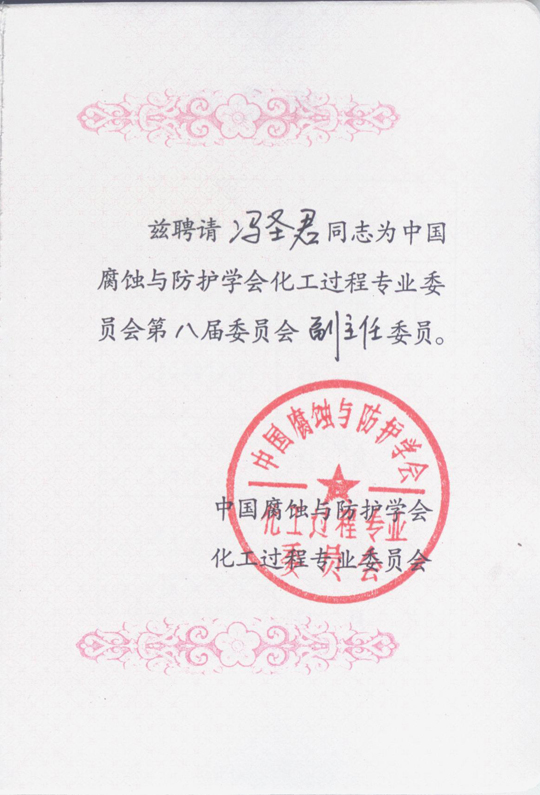 鑒于馮圣君在中國腐蝕與防護領(lǐng)域的杰出貢獻與不懈追求,中國腐蝕與防護學(xué)會經(jīng)過認(rèn)真考察,決定聘任其擔(dān)任化工過程專業(yè)委員會副主任,代表企業(yè)界參與學(xué)會工作。
