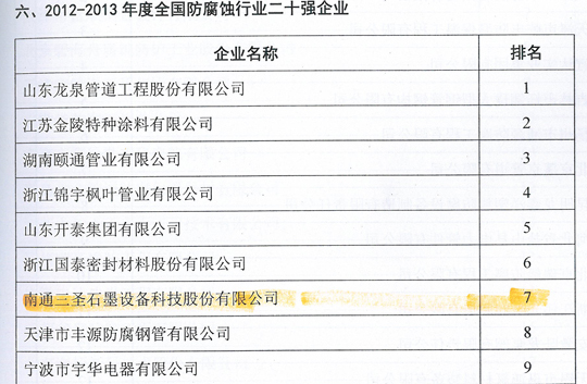 在剛剛閉幕的第五屆中國國際腐蝕控制大會(huì)上,南通三圣石墨設(shè)備科技股份有限公司憑借其優(yōu)異的業(yè)績榮登三大榜單,分別是:"2012-2013年度全國防腐蝕行業(yè)二十強(qiáng)企業(yè)"(排名第7位);"2012-2013年度全國非金屬壓力容器企業(yè)二十強(qiáng)"(排名第1位);"2012-2013年度全國防腐蝕行業(yè)外貿(mào)出口企業(yè)二十強(qiáng)"(排名第6位)。